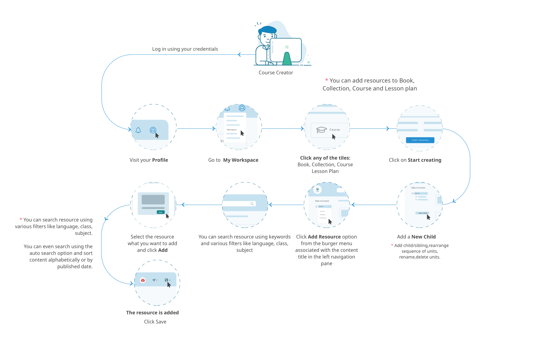 Resources are the simplest unit of content that can be created by any user on DIKSHA using the inbuilt content editor. Various categories of resources can be created on DIKSHA. Registered users with content creation rights can create resources on DIKSHA. The image explains the procedure of creating a resource.