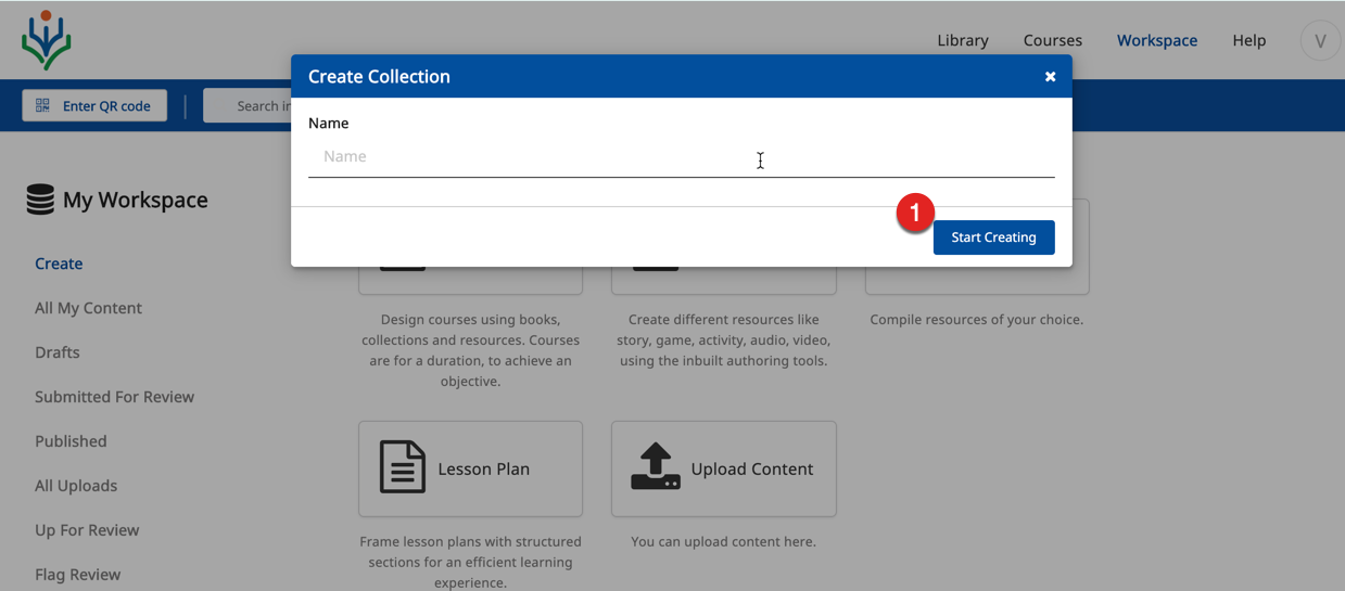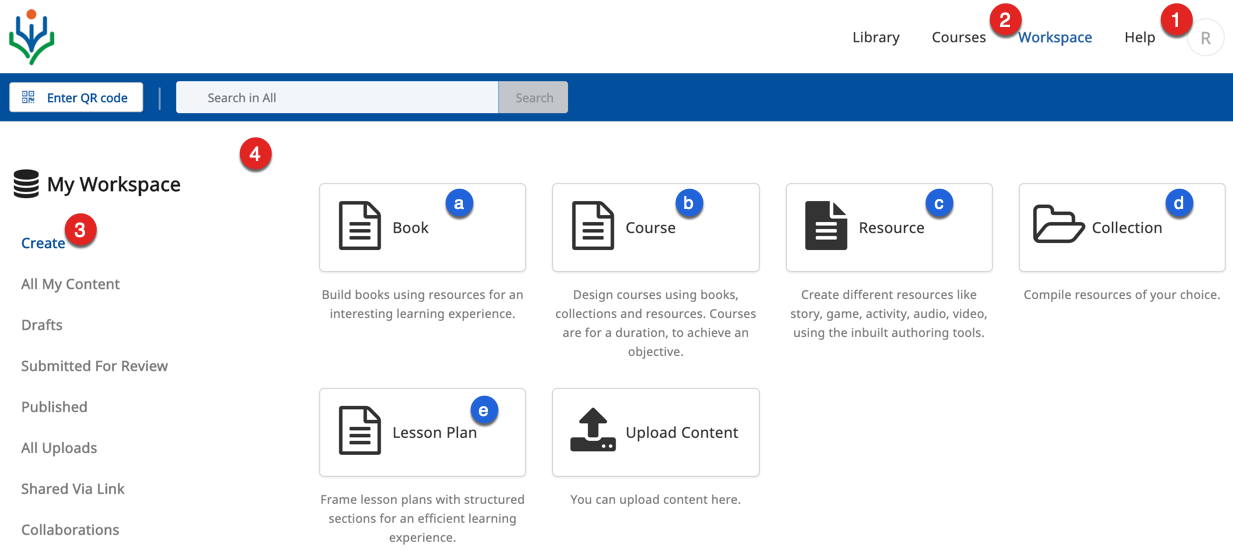 2. You are currently on My Workspace 3. SelectCreate 4. You have clicked any one of the following content tiles: a. Book b. Course c. Resource d. Collection e. Lesson Plan |