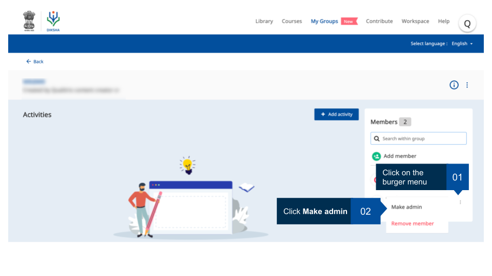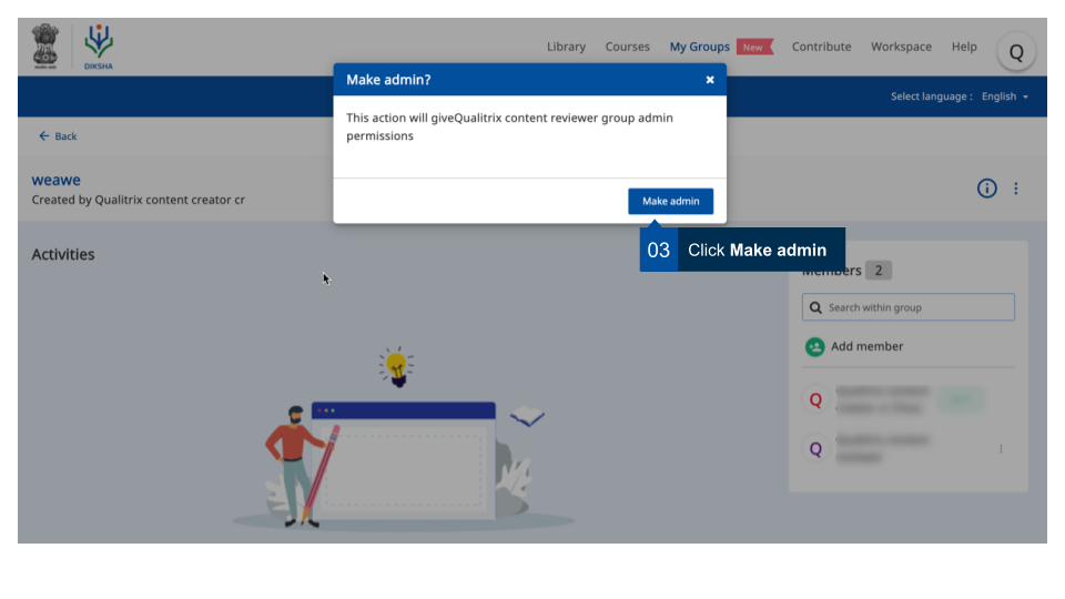 The default group administrator (the group creator) can promote group members as group admins thereby giving them additional rights and permissions. This page provides step-by-step instruction on how to make a group member a group administrator.
