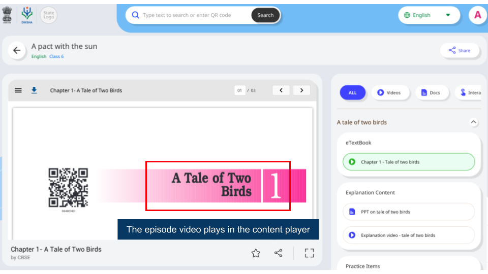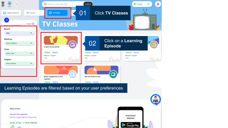 TV Classes is a new medium of instruction as per MHRD. Classes are available in the form of TV episodes. These episodes are uploaded on DIKSHA, and the episodes can directly be opened on the inbuilt content player. The content player supports a maximum file size of 500 MB.