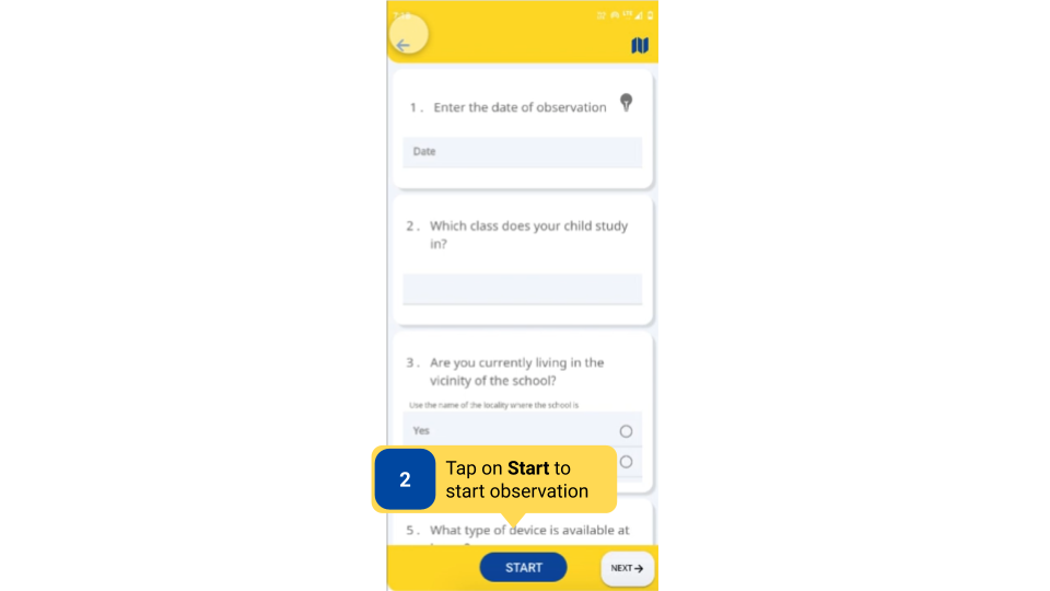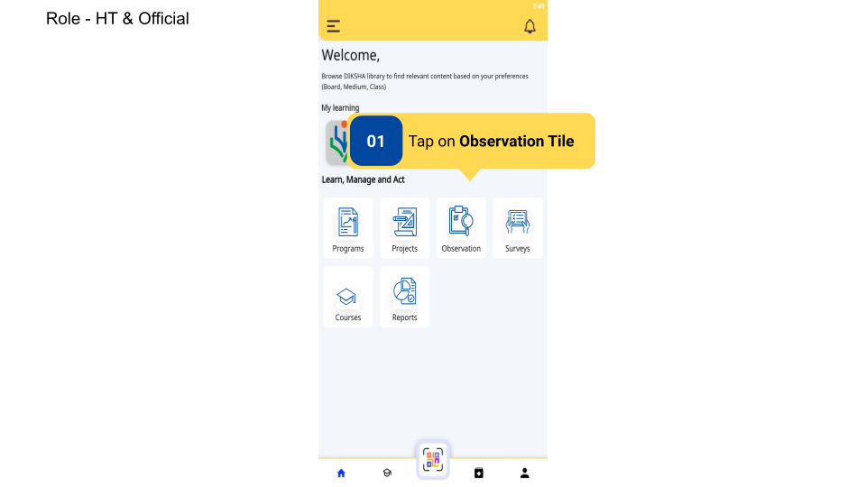 • On the DIKSHA app, using the Observation tile, link, or QR Code