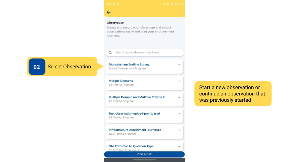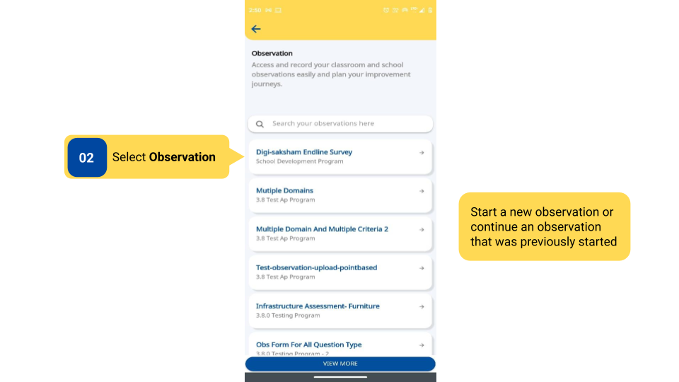 • Users can access their mapped Observations using the portal as well. The Observations on the portal are also available for the targeted users only (HT & Officials and Teachers).