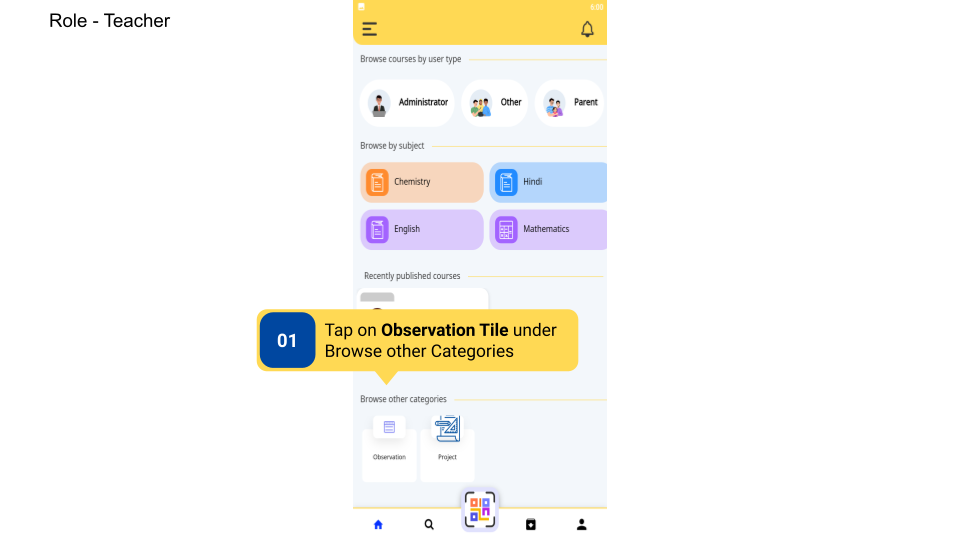 • Teachers can access Observations using the Observation tile in the Browse other categories section, through links and QR codes, provided it is enabled for the board selected in the profile.