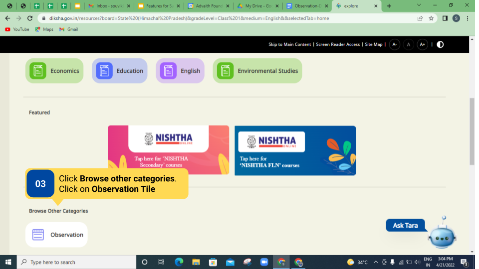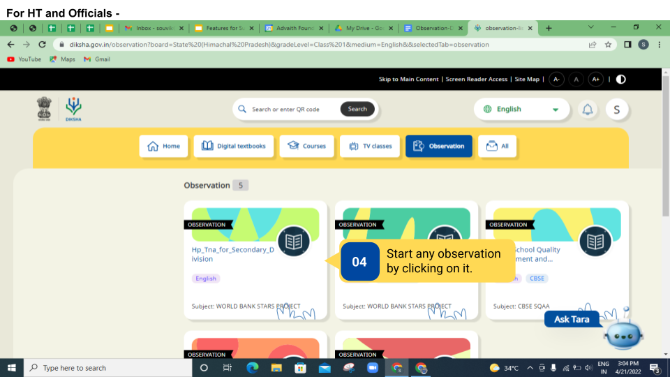 • DIKSHA Observations are created by Content Creator and can be viewed by signed-in users who are logged in as HT & Officials or teacher profiles.