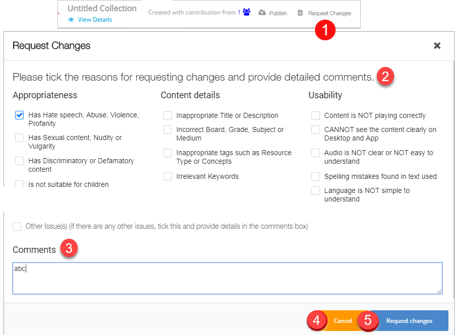 2. Select the appropriate reason from the list 3. Enter comment in the Comment section 4. Click Cancel to cancel 5. Click Request Changes Note: Once changes are requested in the book, the creator is notified of the same and the book is rolled to draft stage |