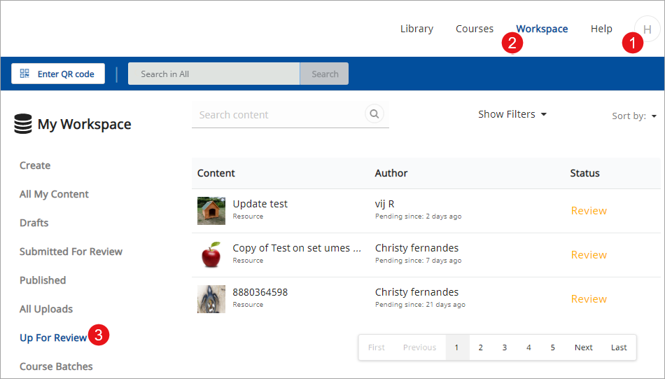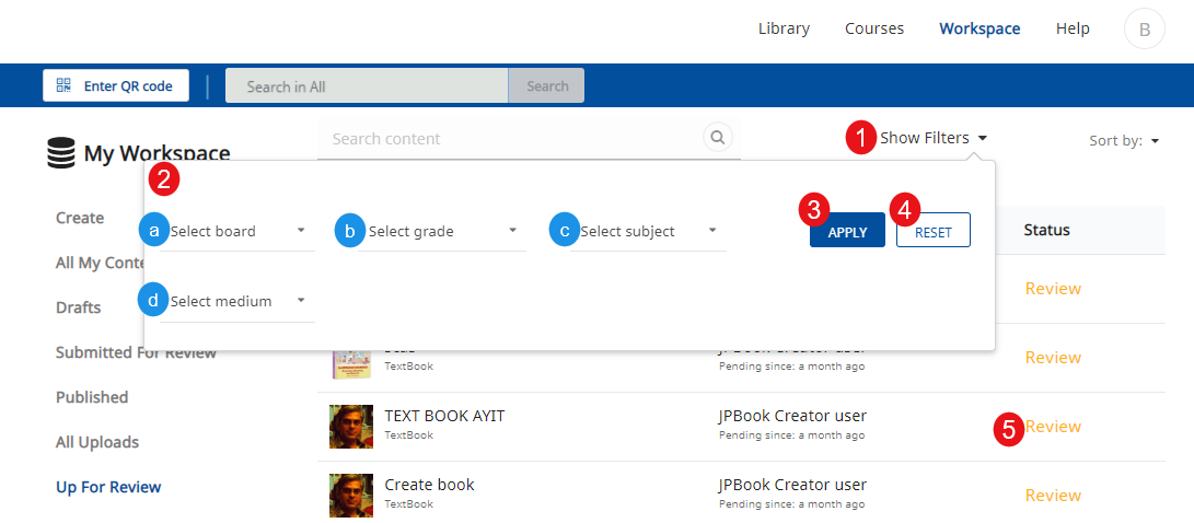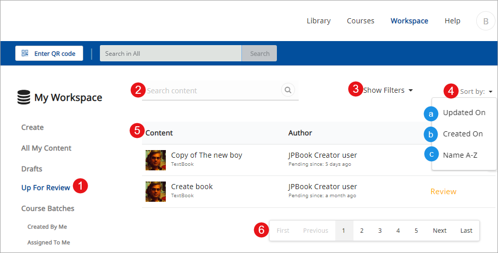 2. Type keywords to search any particular book to review. Keywords can be details of book name, author, concept 3. Alternatively, apply filters to search for book 4. Click Sort by to sort book. You can sort book based on: a. Updated on b. Created on c. Alphabetically 5. List of books which are up for review is displayed here 6. Click on the page navigation to access the required list on a particular page |