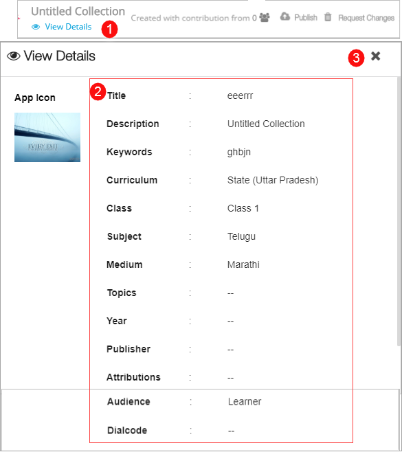 2. You can view the following details of the book: a. Name b. Description c. Topics d. Keywords e. QR code Required f. QR code 3. Click View Details to view the book deatils 4. Click Request Changes to notify the creator to make changes in the book according to guidelines 5. Click Publish to publish the book 6. Click Contributor icon to view the list of contributor |